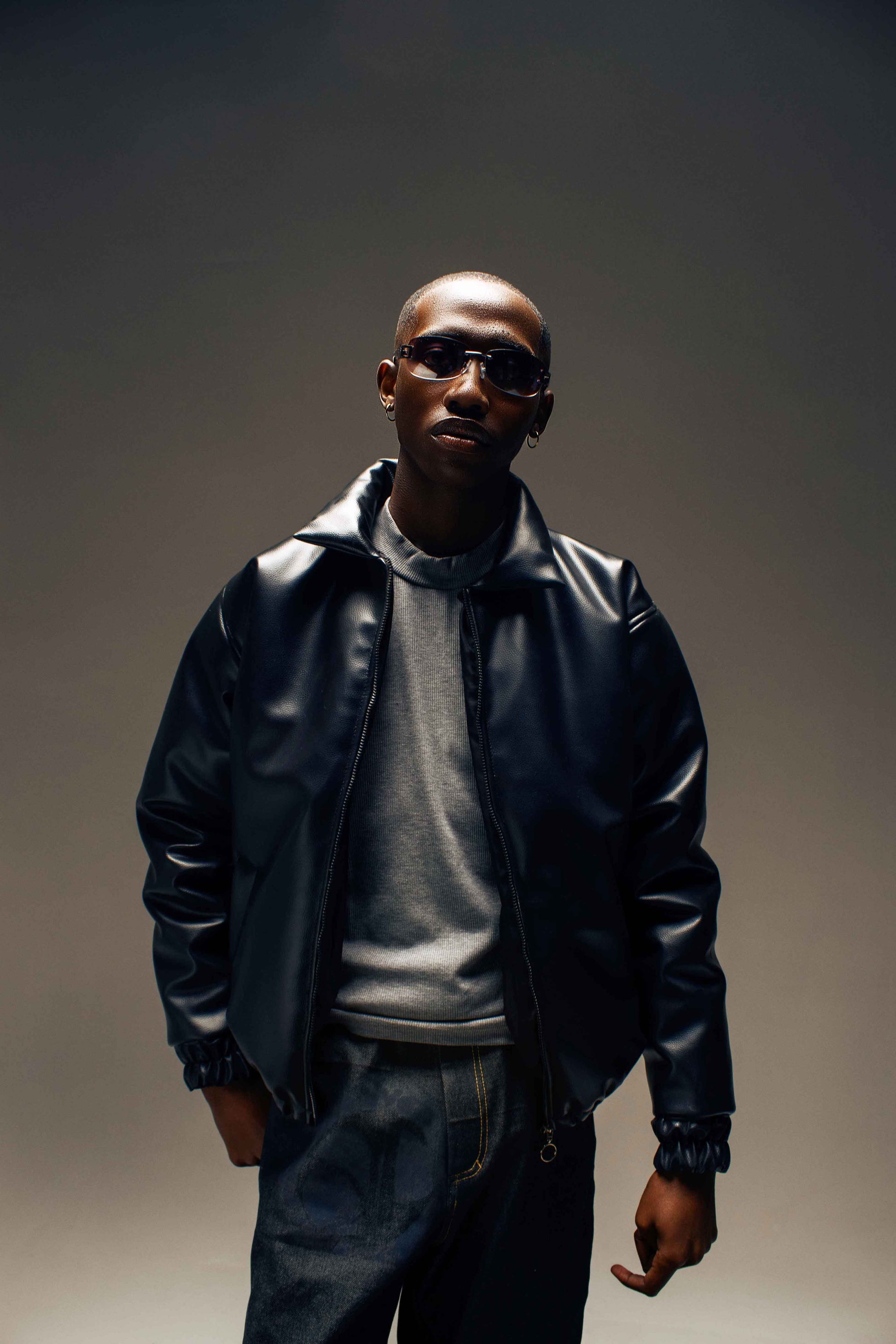 Leather appearing bomber jacket with elastic wrist and waistline. Silver metal zip and patchwork of brand logo on the back. Black lining and black label care . leather pockets